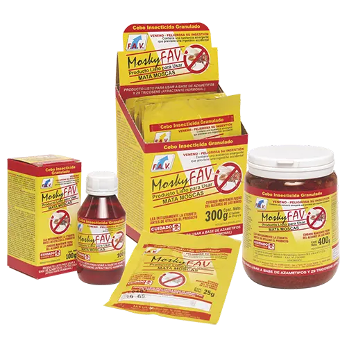 Es un cebo granulado que contiene un poderoso insecticida indicado para combatir todo tipo de moscas y otros insectos (cucarachas) en instalaciones rurales e industriales, viviendas, depósitos, basurales, frigoríficos, mataderos, restaurantes, carnicerías, panaderías, industrias alimenticias y de bebidas, etc. En su fórmula se ha incorporado un potente atractante hormonal que induce a las moscas a posarse sobre los gránulos del cebo e ingerirlos.